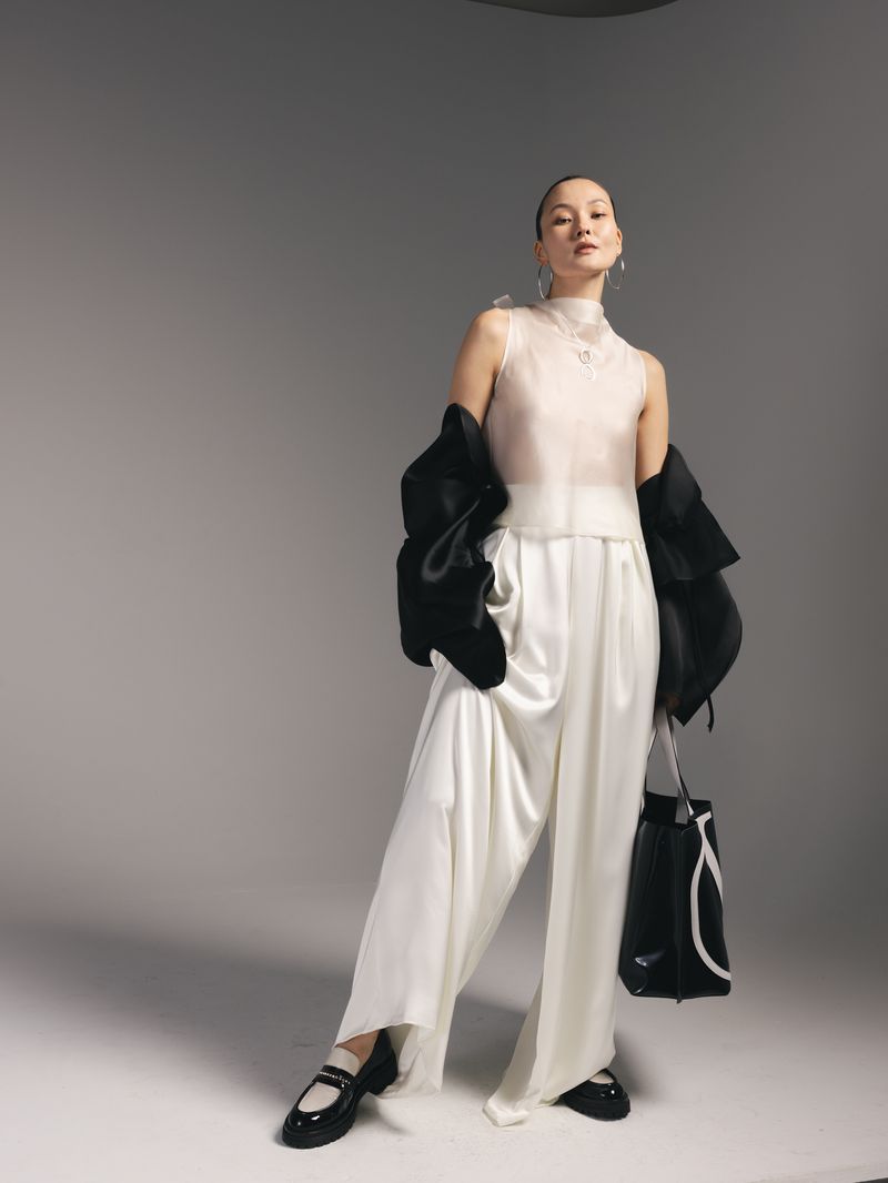 This organza bomber jacket blends edgy style with sheer elegance, featuring a lightweight, translucent design that adds a modern, airy twist to the classic bomber silhouette.