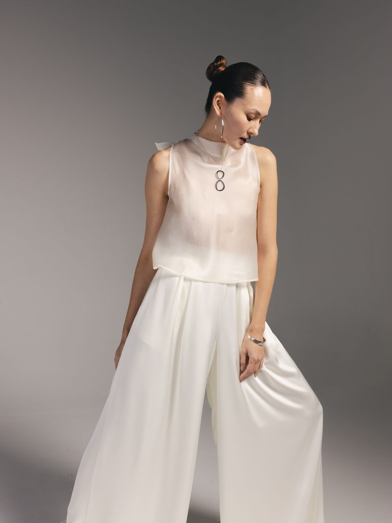 This elegant, sleeveless top features a graceful halter neck and a fluid drape, blending minimalist elegance with all-day comfort—perfect for layering or wearing solo.